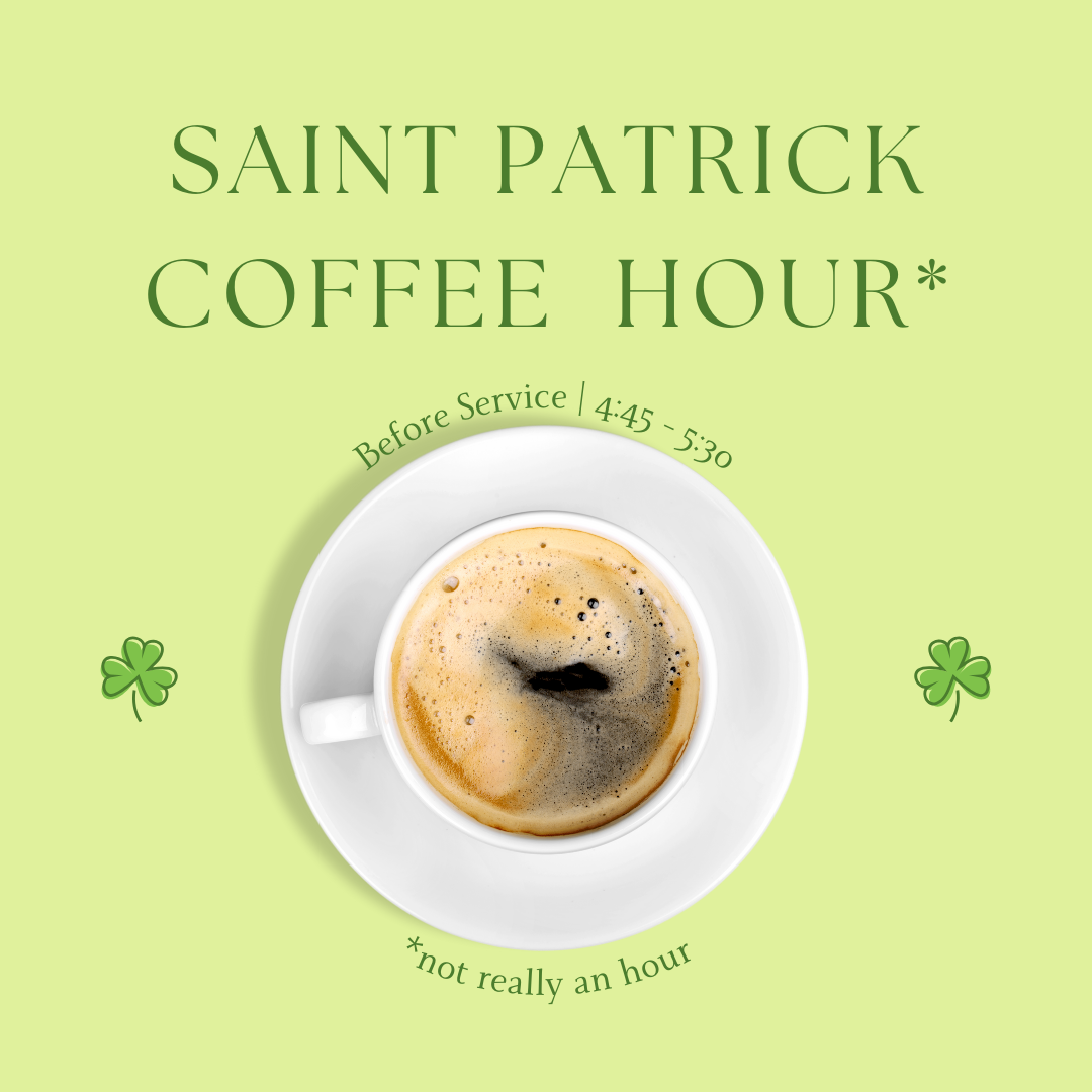 On Saturday, March 15, join us at our normal Coffee Hour time for our celebration of St. Patrick! Come for coffee and snacks; and don’t forget to wear green!